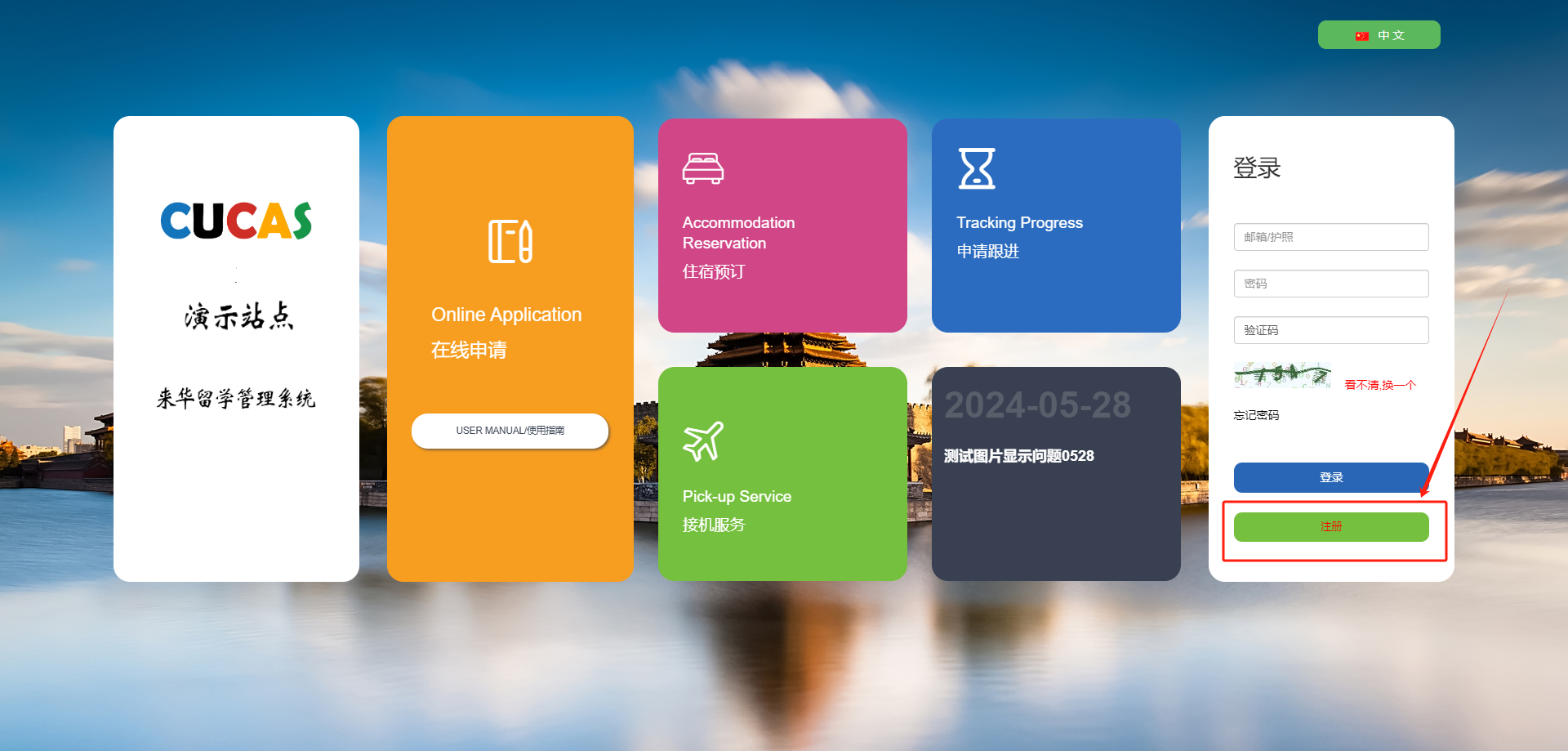 1、打开网址https://bucea.cucas.cn/cn/,点击左下方“注册”。