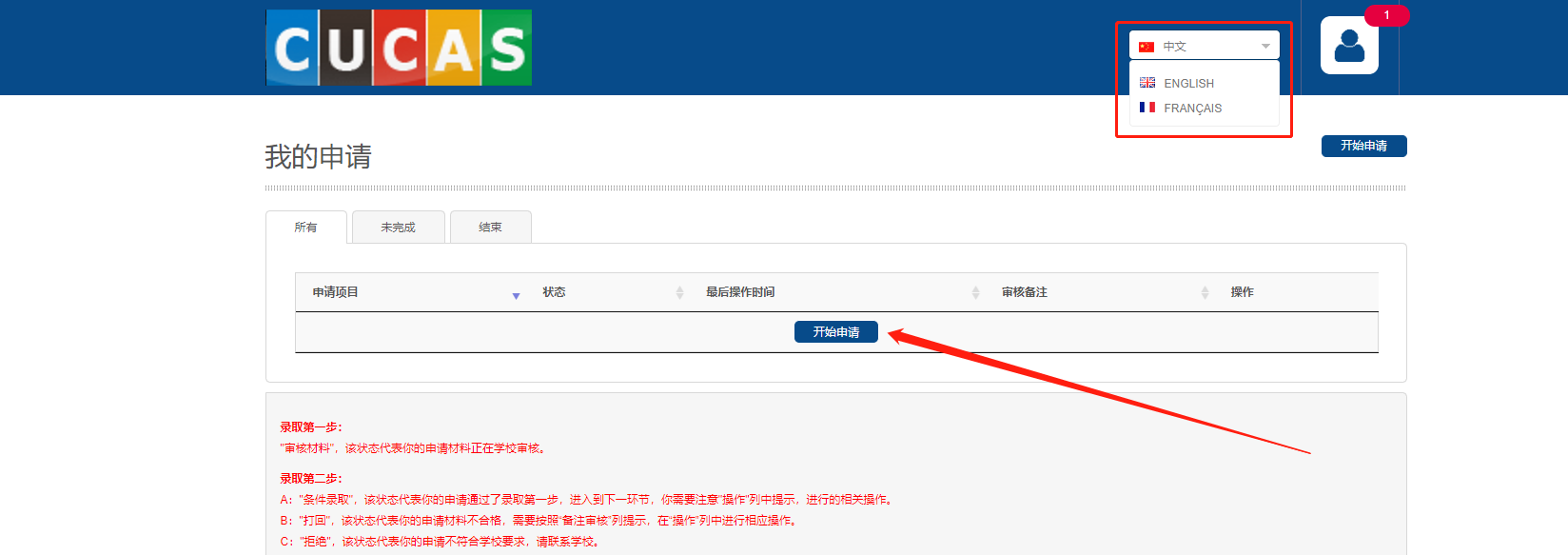 6、点击“开始申请”,发起申请。(右上角可以进行语言切换)