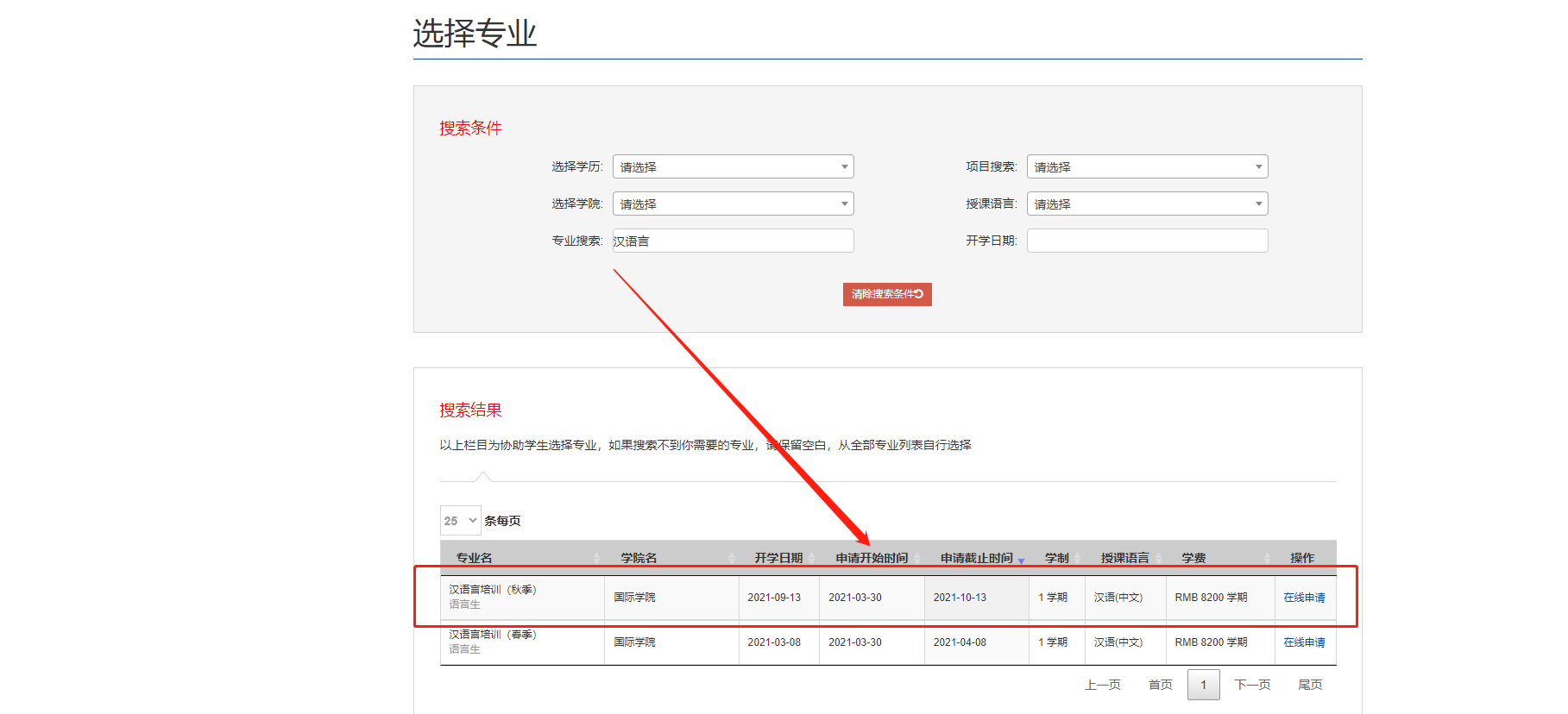 7、筛选获得目标专业后,点击右侧“在线申请”, 进入申请页面。