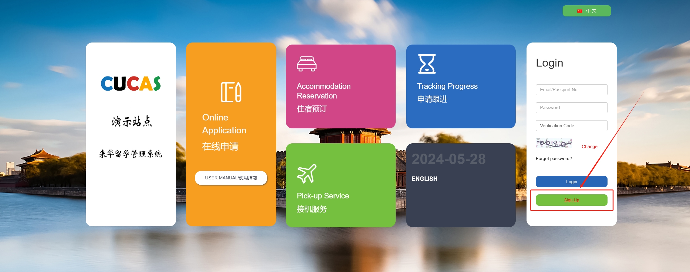 1、Open the website https://bucea.cucas.cn/en/ ,and click the “Sign up” at the bottom left. You can start your registration.