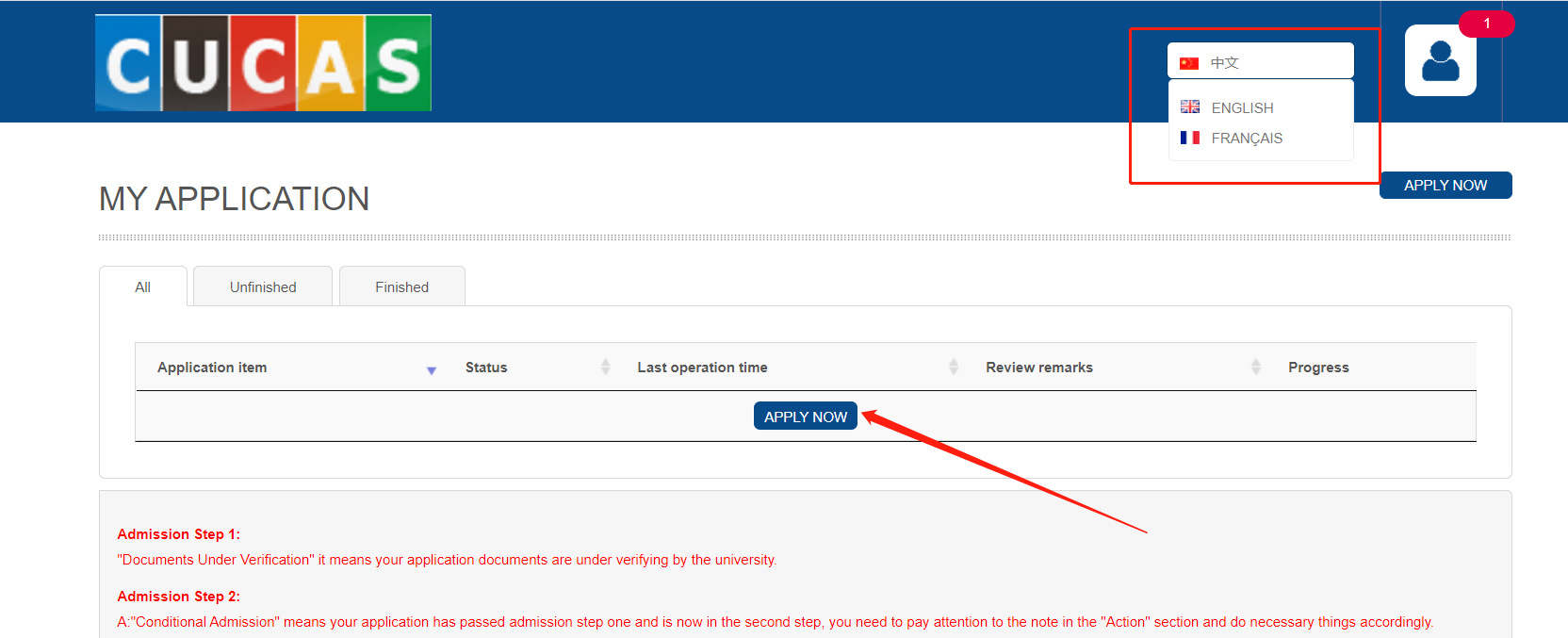 6、If you want to switch other languages, please click on the top-right corner to do so. And then you can click the “APPLY NOW” to start your application.