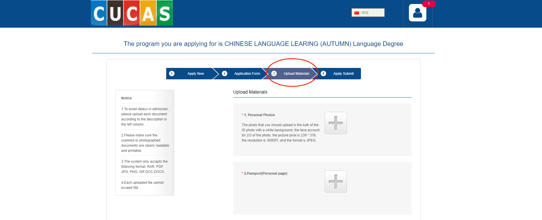 9、Please upload the materials (items with “*” is necessarily), and click “Next”.